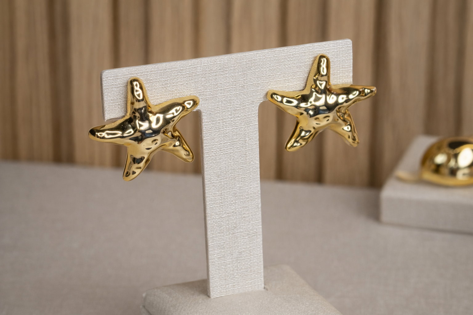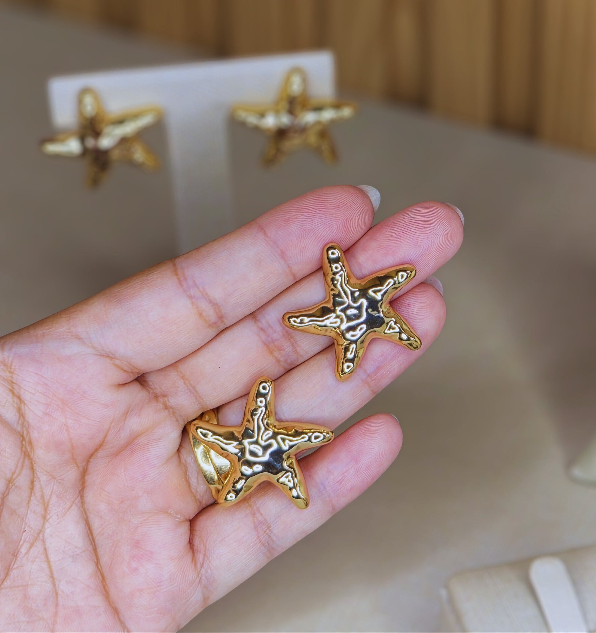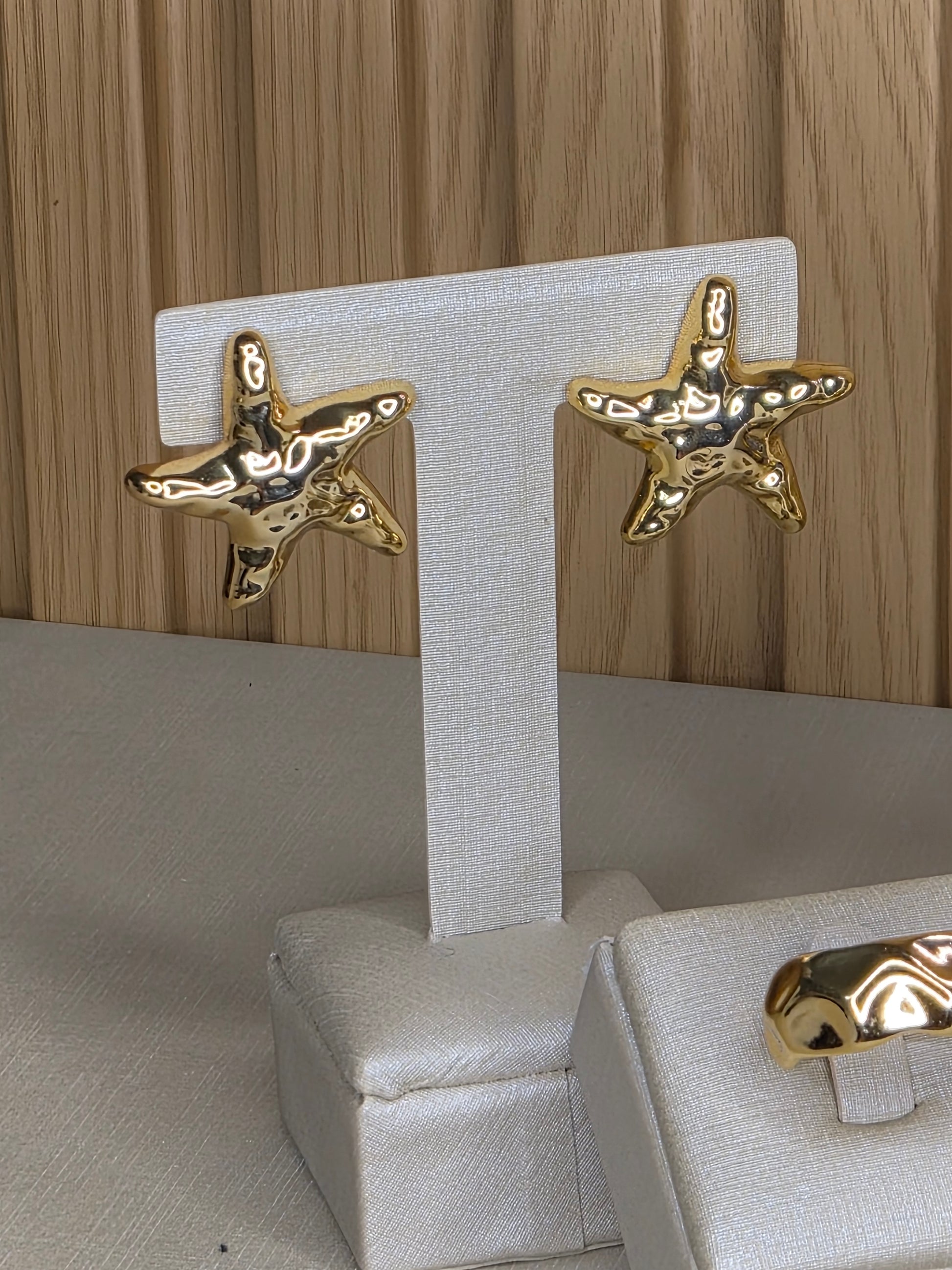 Delicado e sofisticado, este brinco em formato de estrela do mar traz um design orgânico com acabamento dourado, que reflete a luz de forma elegante. Inspirado na beleza natural do oceano, é a escolha perfeita para quem busca um acessório moderno, versátil e cheio de charme.