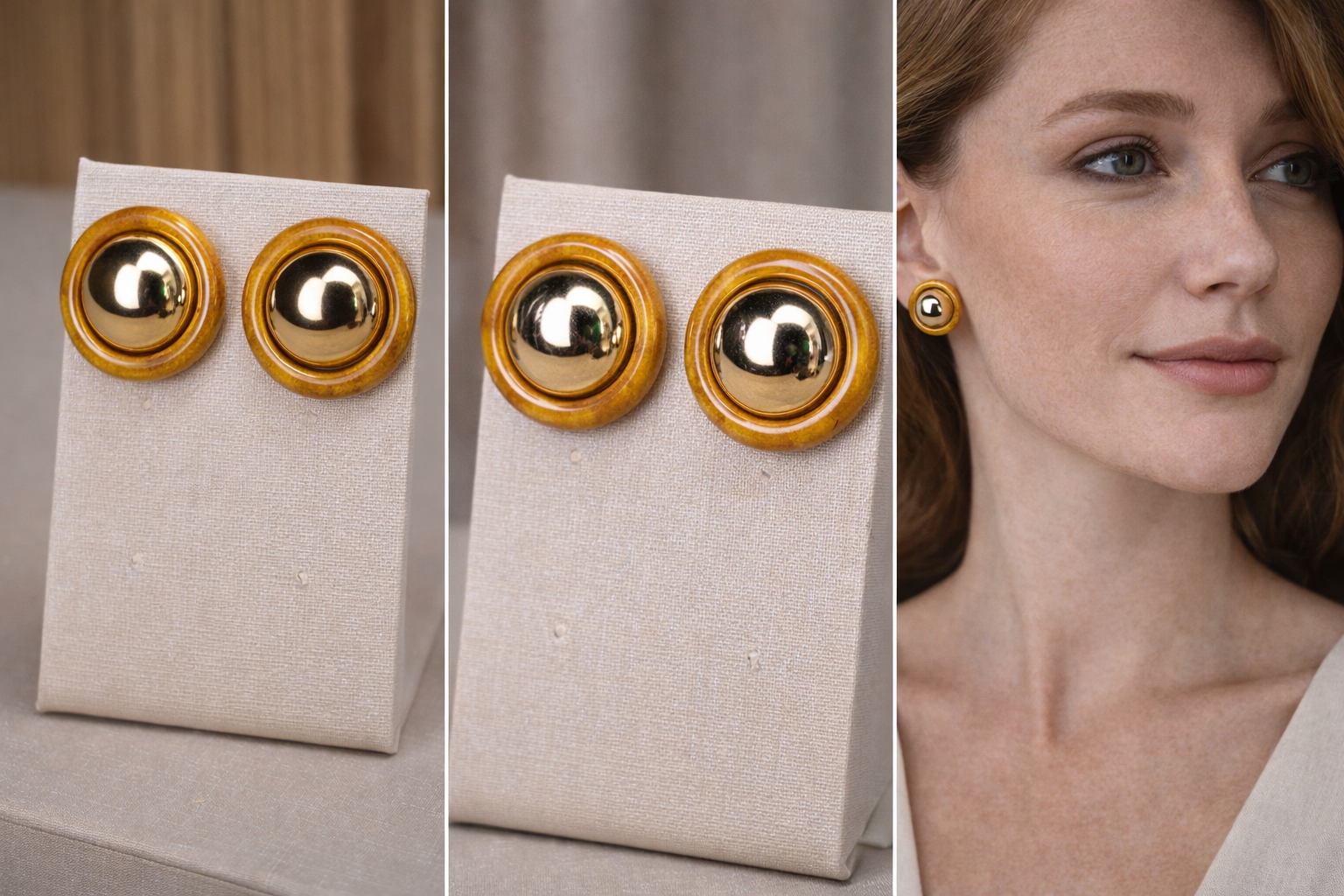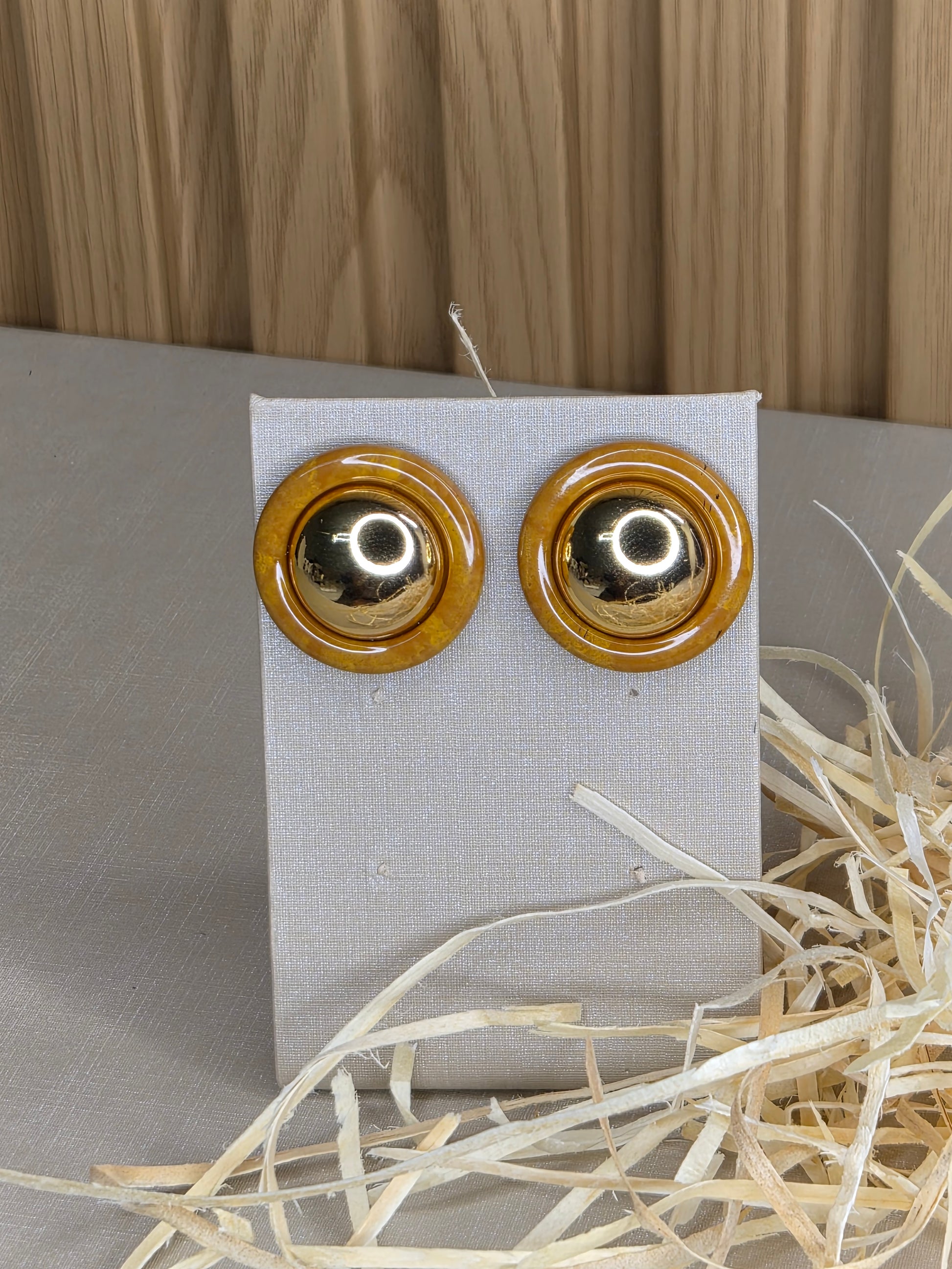 Este brinco é a definição de elegância clássica com um toque contemporâneo. Seu design redondo traz um centro em metal dourado de alto brilho, envolvido por uma delicada moldura em resina tom âmbar, que adiciona profundidade, charme e sofisticação à peça.