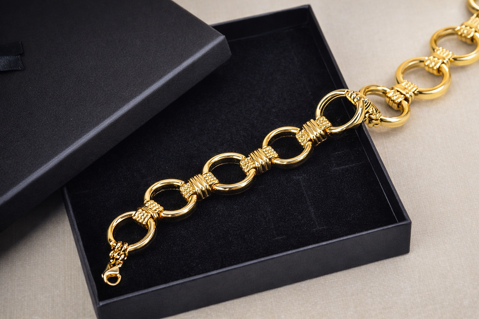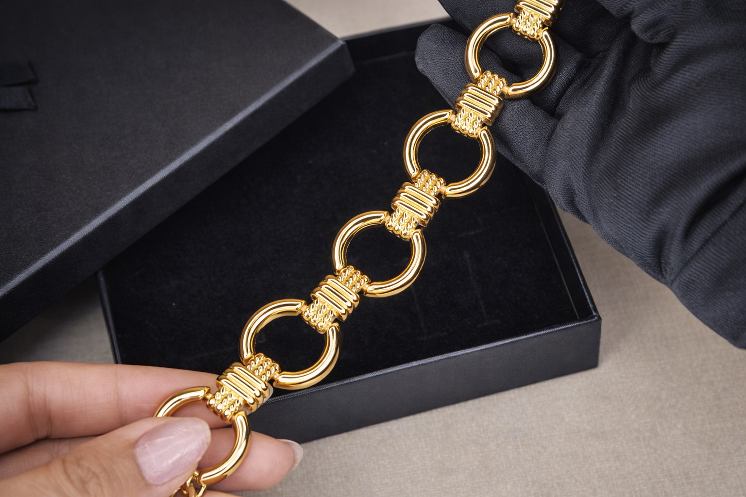 O Colar AURUM Elos Imperiais é uma semi joia de presença marcante e sofisticação atemporal. Seu design estruturado combina elos arredondados com detalhes texturizados, criando um visual elegante, poderoso e refinado.