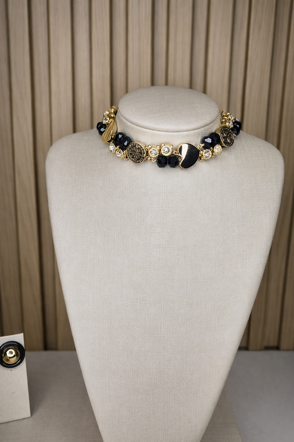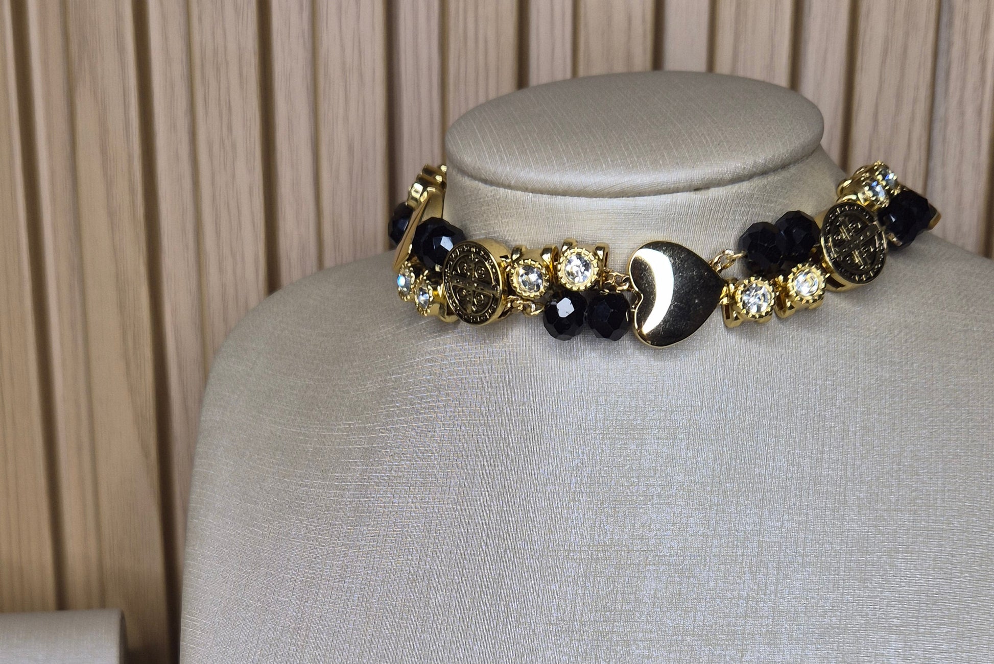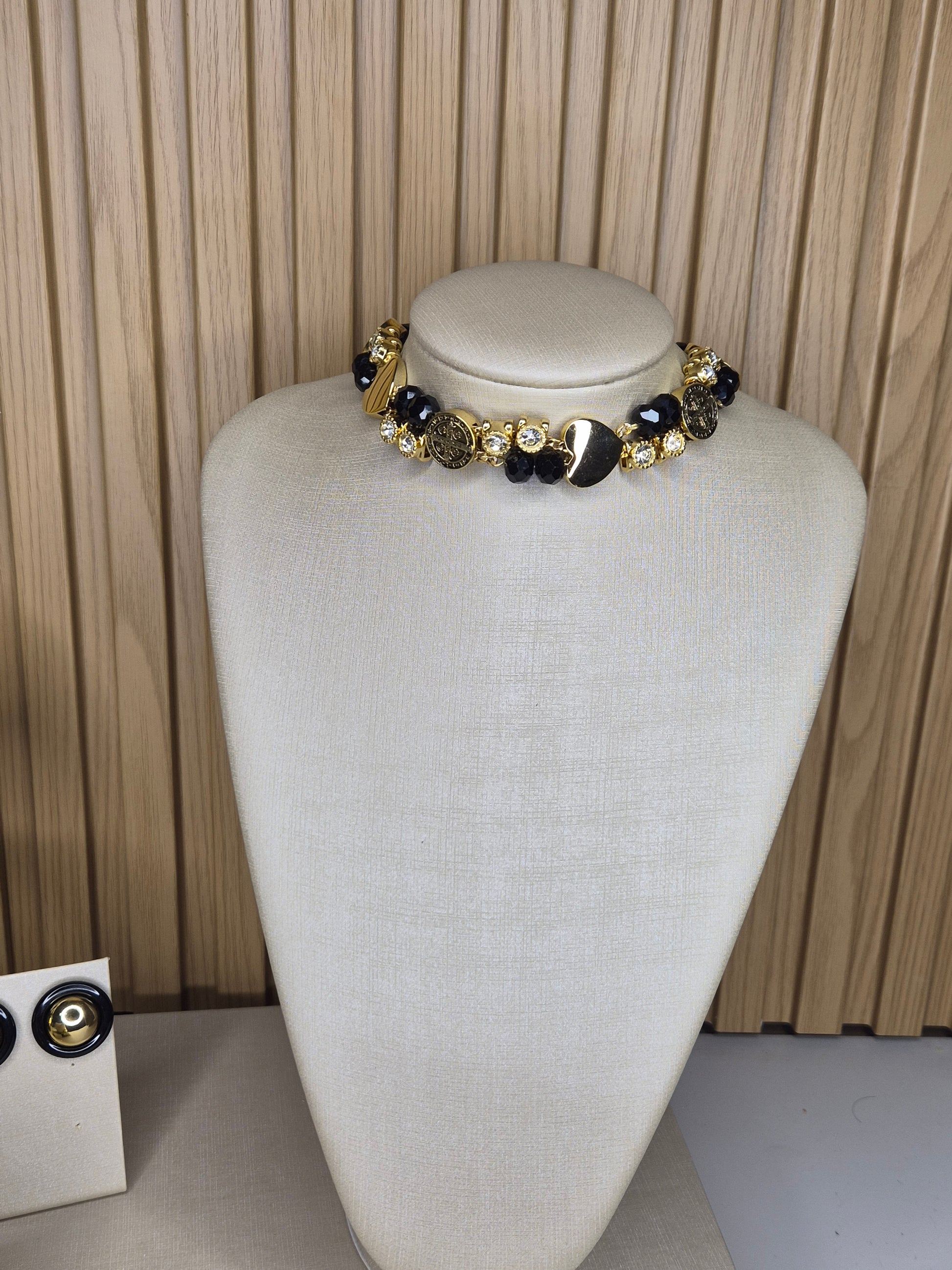 Uma criação exclusiva AURUM, desenvolvida para mulheres que valorizam design autoral e sofisticação. Este colar premium combina elementos dourados de acabamento refinado, cristais pretos, resultando em uma composição elegante e marcante. O design exclusivo ganha destaque com medalhões DE CORAÇÃO E SÃO BENTO delicadamente trabalhados.