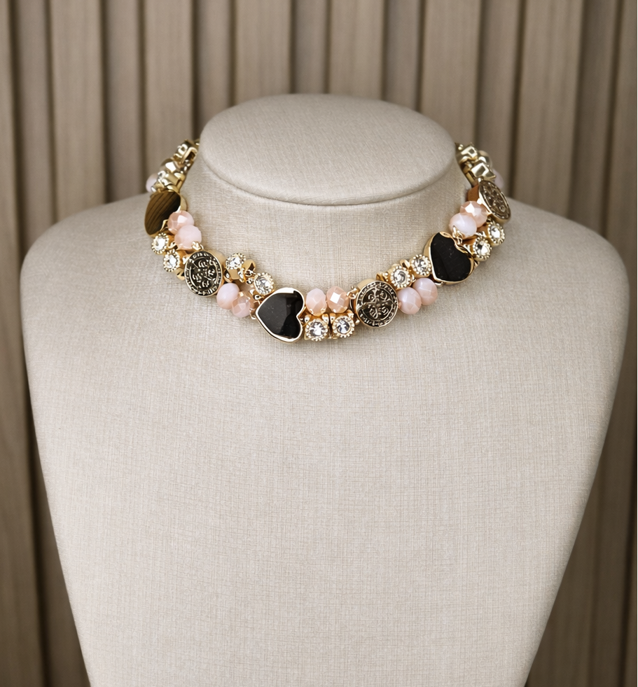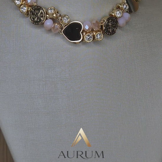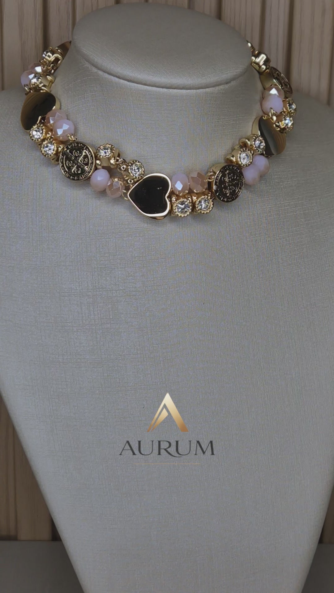 Uma criação exclusiva AURUM, desenvolvida para mulheres que valorizam design autoral e sofisticação. Este colar premium combina elementos dourados de acabamento refinado, cristais rosa, resultando em uma composição elegante e marcante. O design exclusivo ganha destaque com medalhões delicadamente trabalhados.Tamanho: tamanho das correntes podem varear, peça vai com extensor para regulagem no pescoço de cada cliente. Qualidade Aurum garantida.