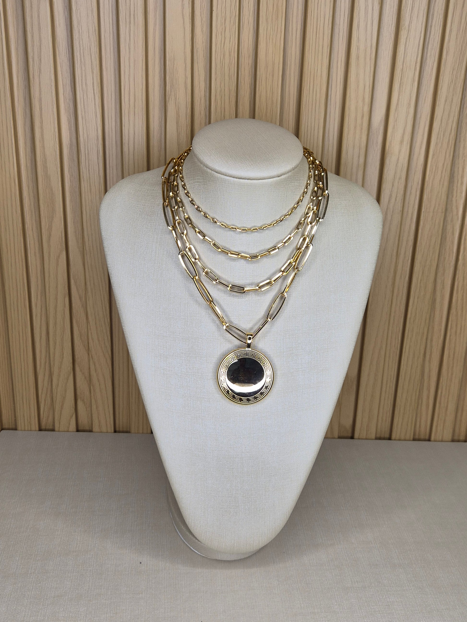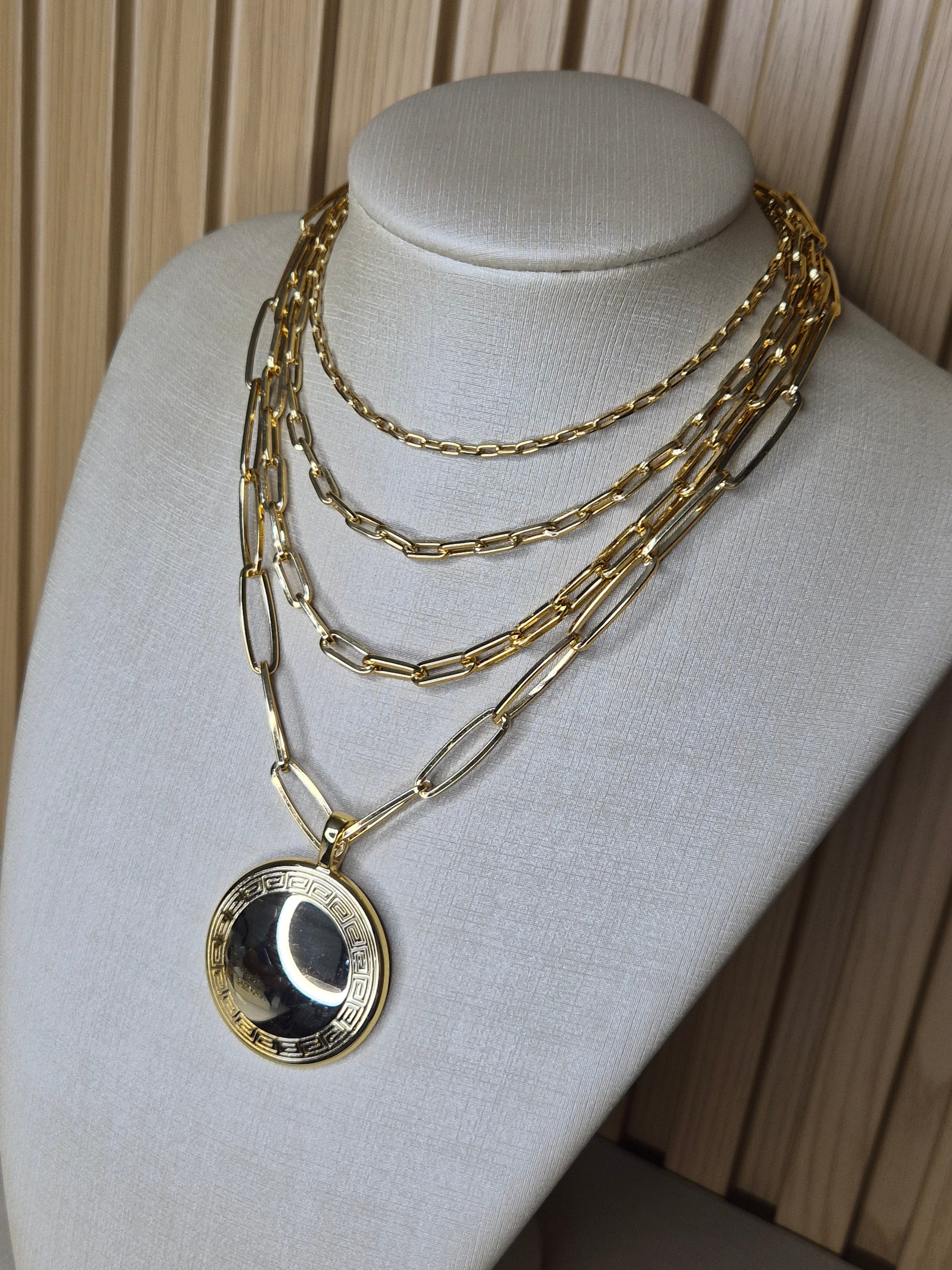 O Colar Imperial Três Elos AURUM é a expressão máxima de elegância contemporânea. Composto por três voltas de elos alongados em acabamento dourado, a peça cria um visual imponente e refinado, valorizado por um medalhão central espelhado com detalhes clássicos em relevo.