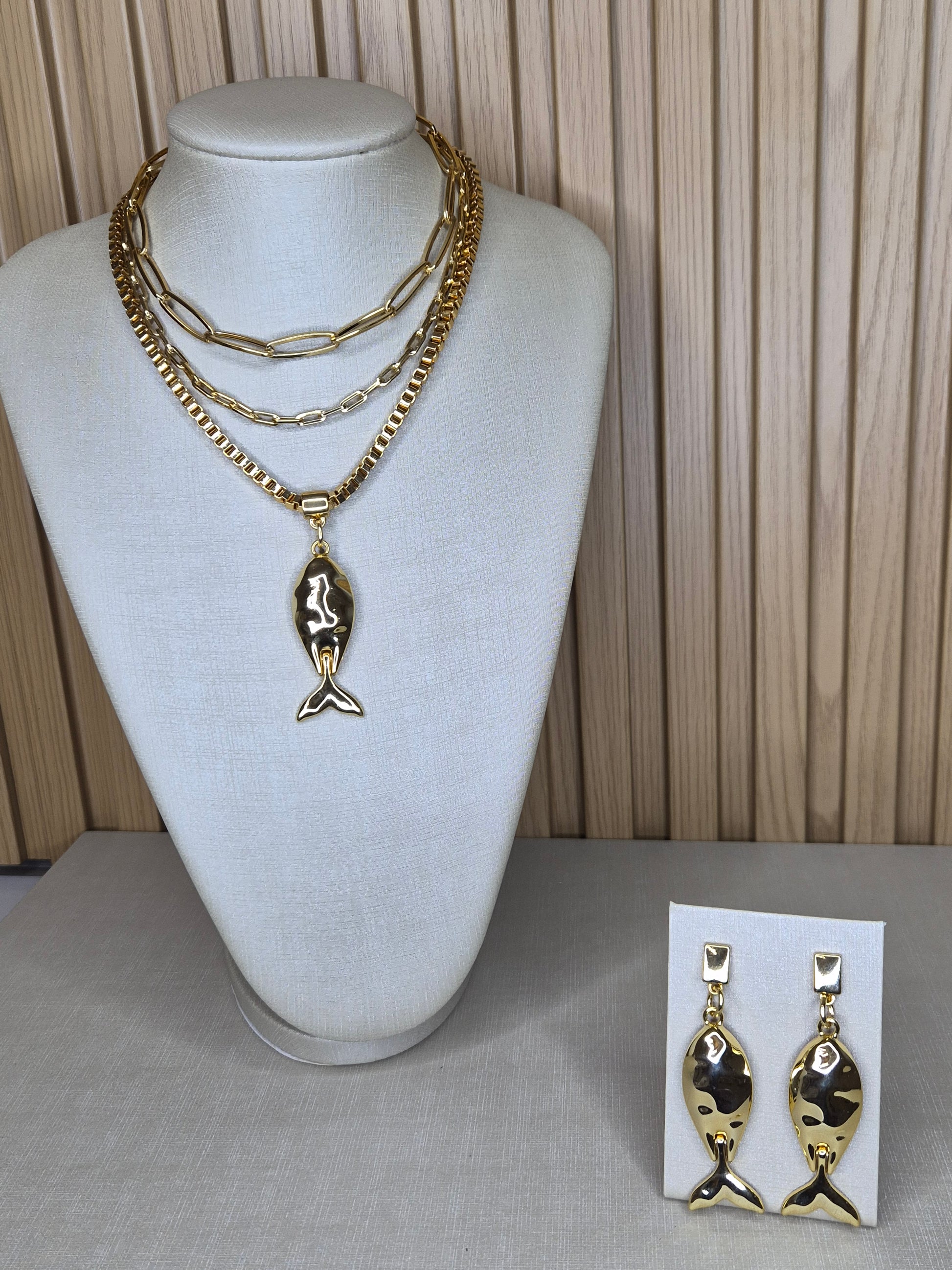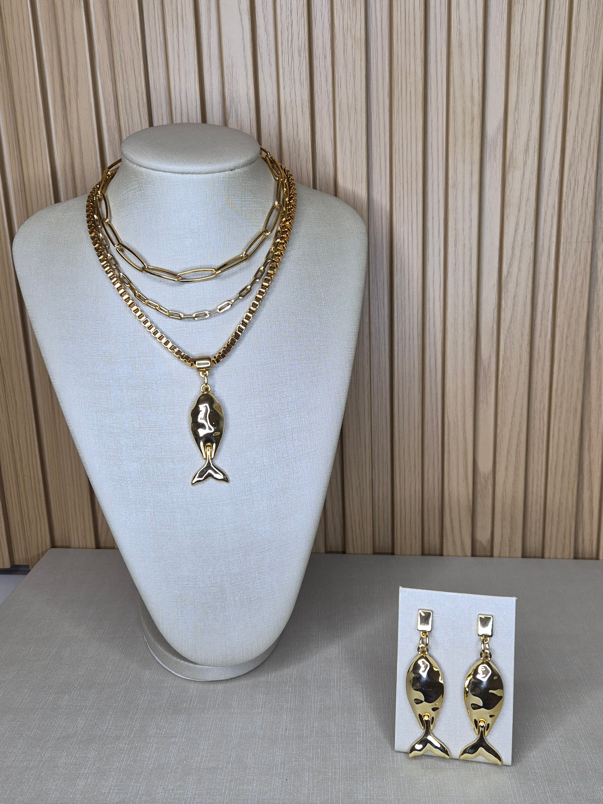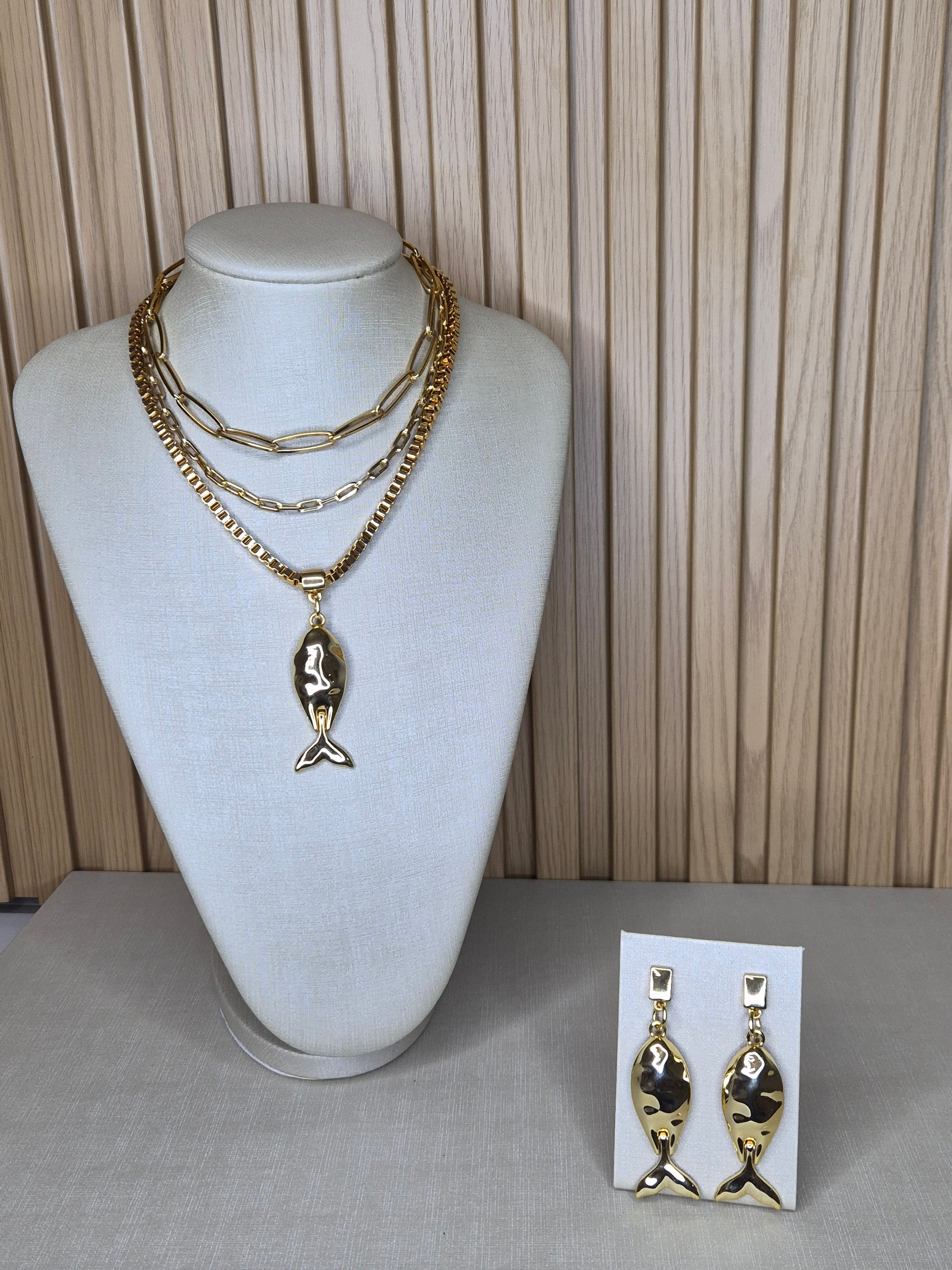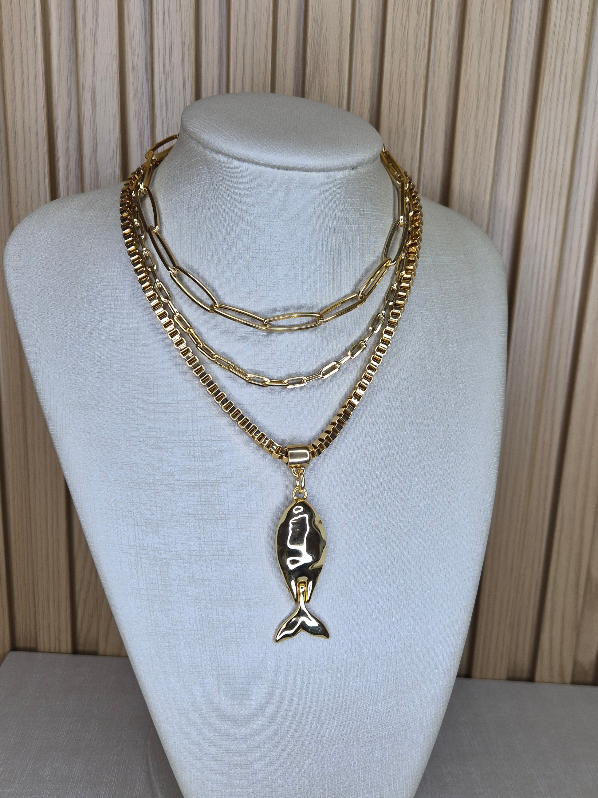 Colar com correntes em camadas e medalhão central espelhado, envolto por acabamento dourado com detalhe geométrico. Uma peça imponente e sofisticada, que une design contemporâneo e elegância atemporal.